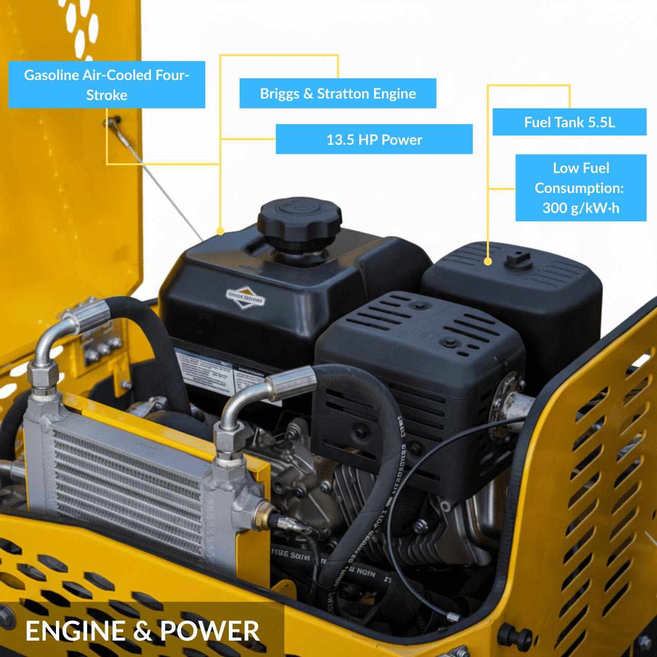 - Power & Build: A 1-ton sturdy frame powered by a 13.5 hp Briggs & Stratton engine, offering 0–8 km/h speed range and an efficient 300 g/kWh fuel rate with a 5.5L tank.