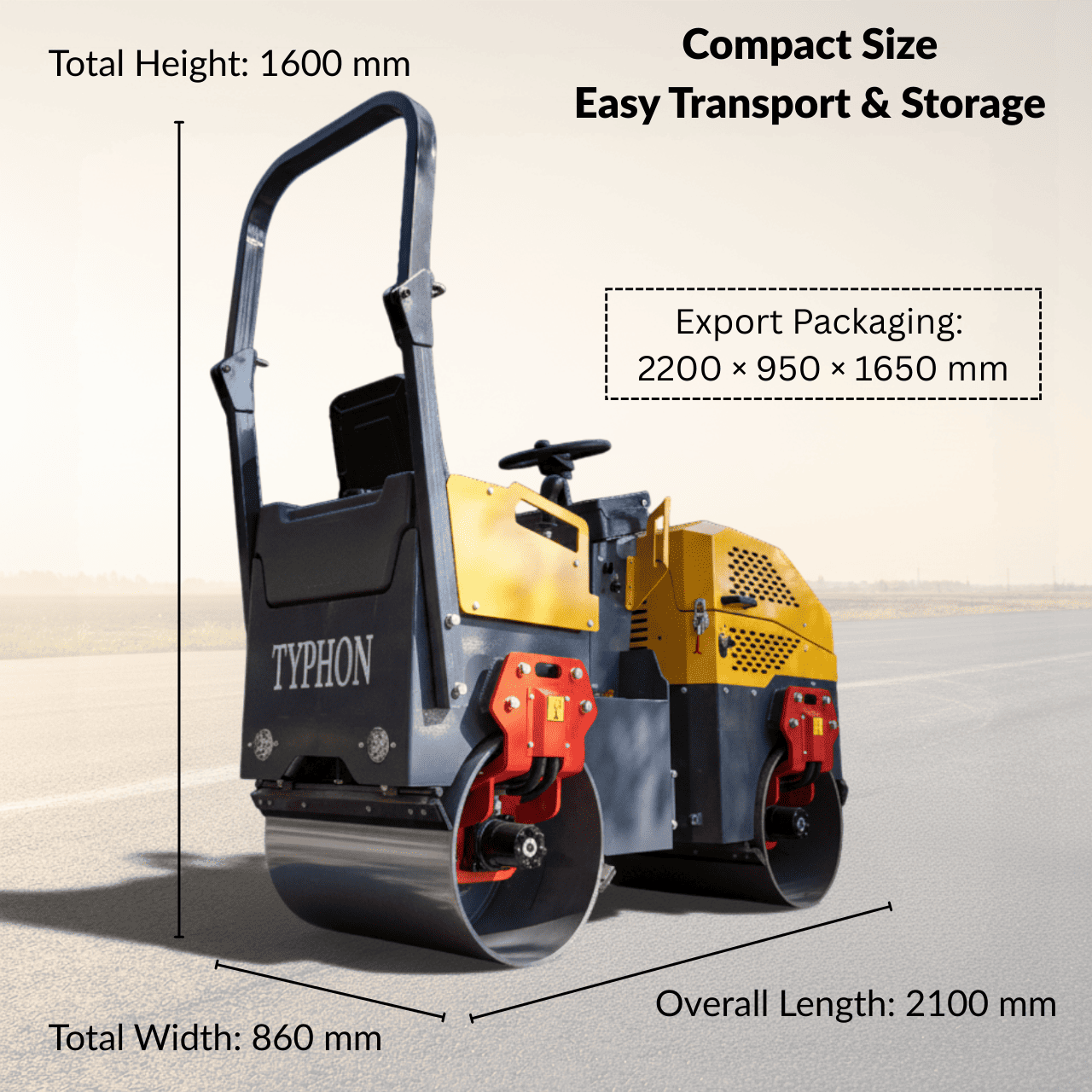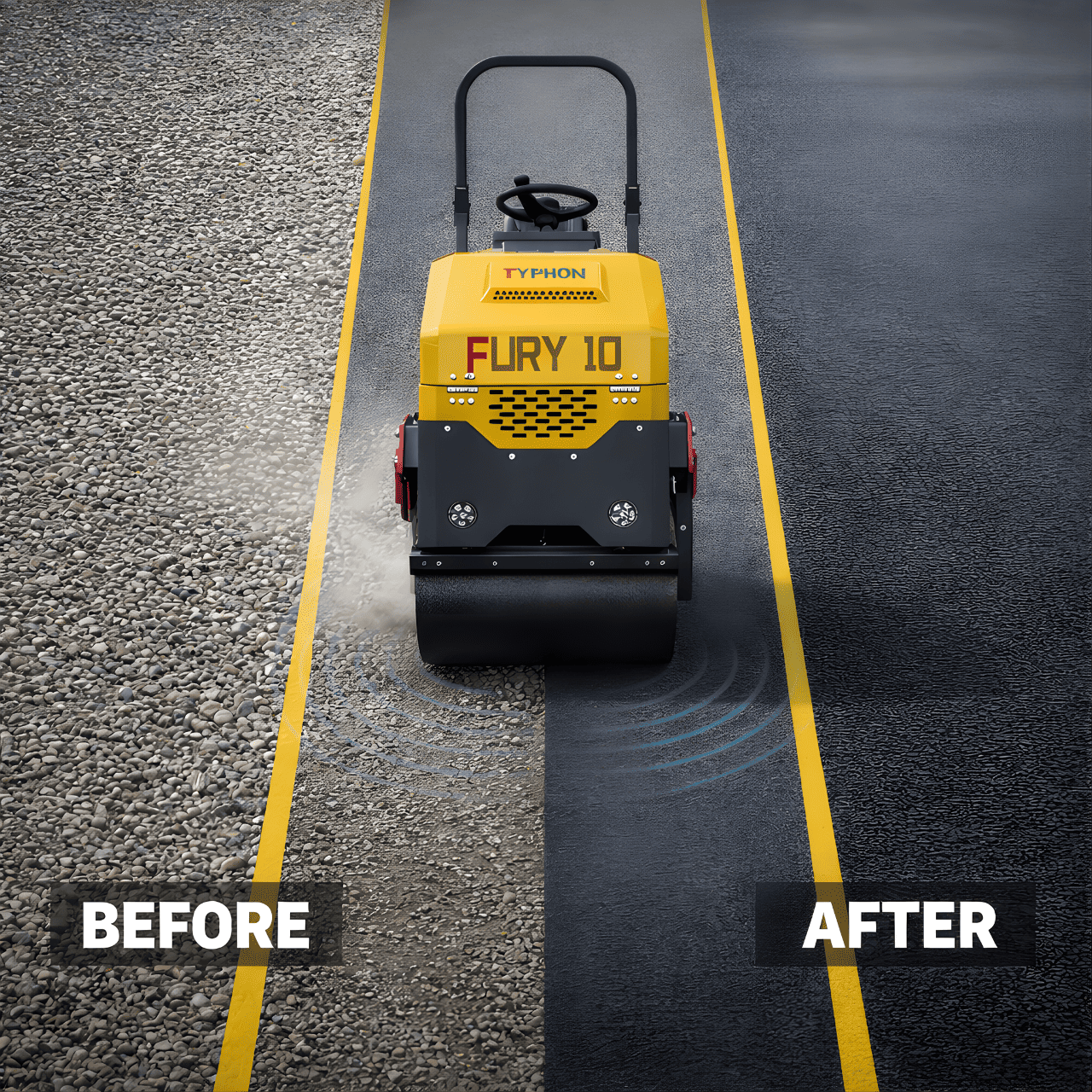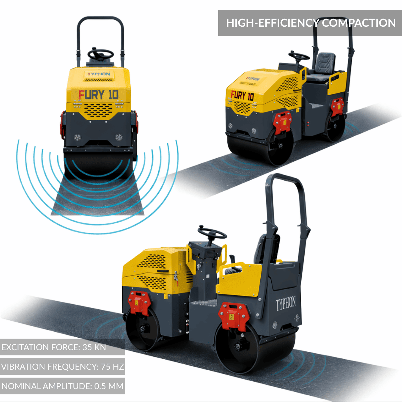 The TYPHON Fury 10 mini road roller delivers reliable and efficient compaction on asphalt, soil, and gravel. It features a 1-ton operating weight, providing the perfect balance of power and maneuverability for small-to-medium jobs, designed for road construction, paving, and landscaping, its compact footprint allows smooth operation in confined spaces while maintaining excellent stability.