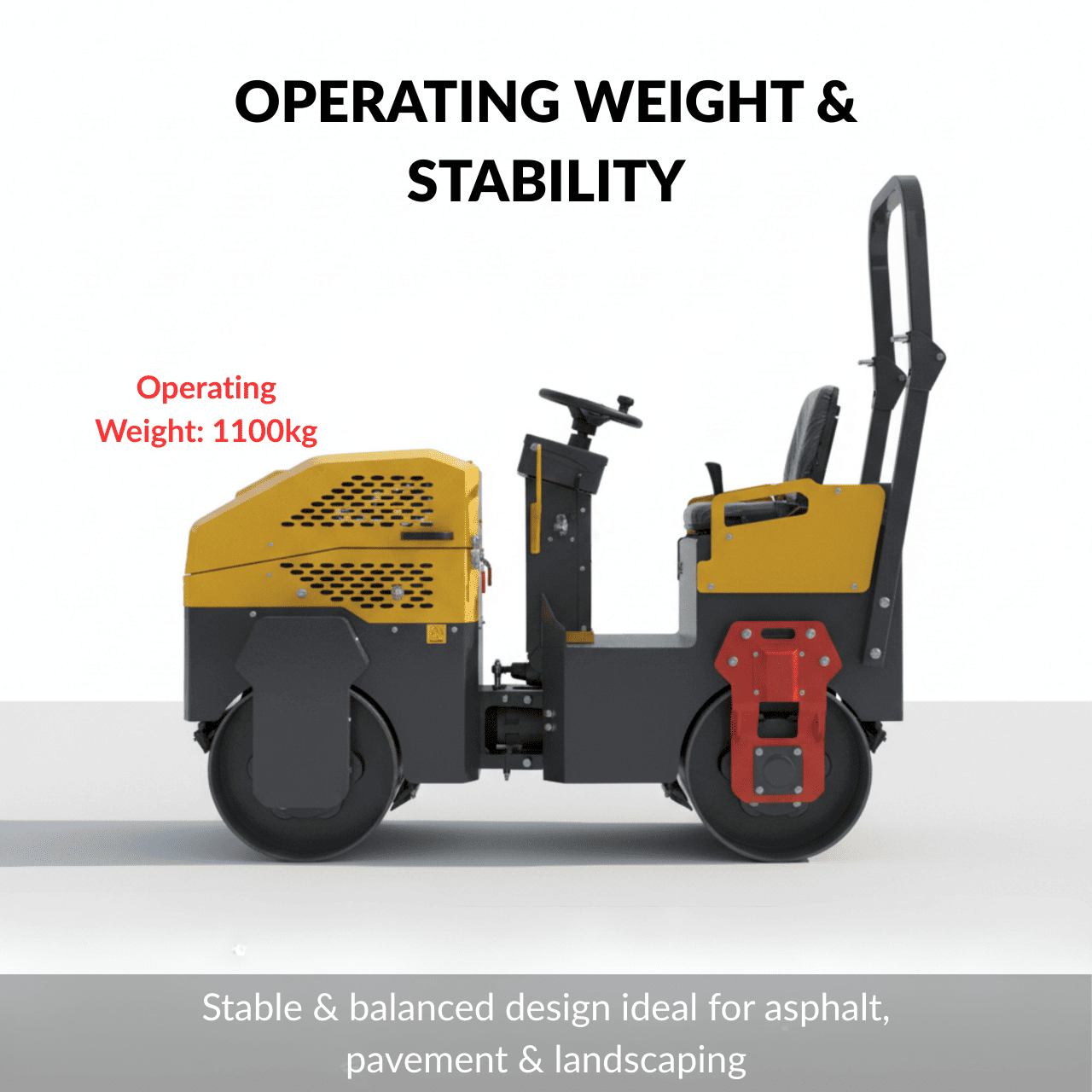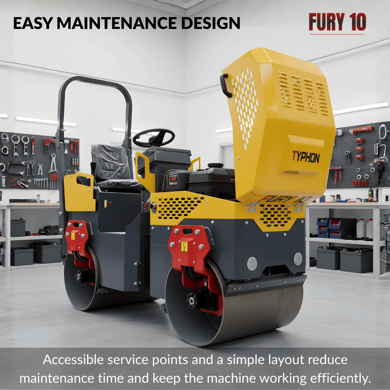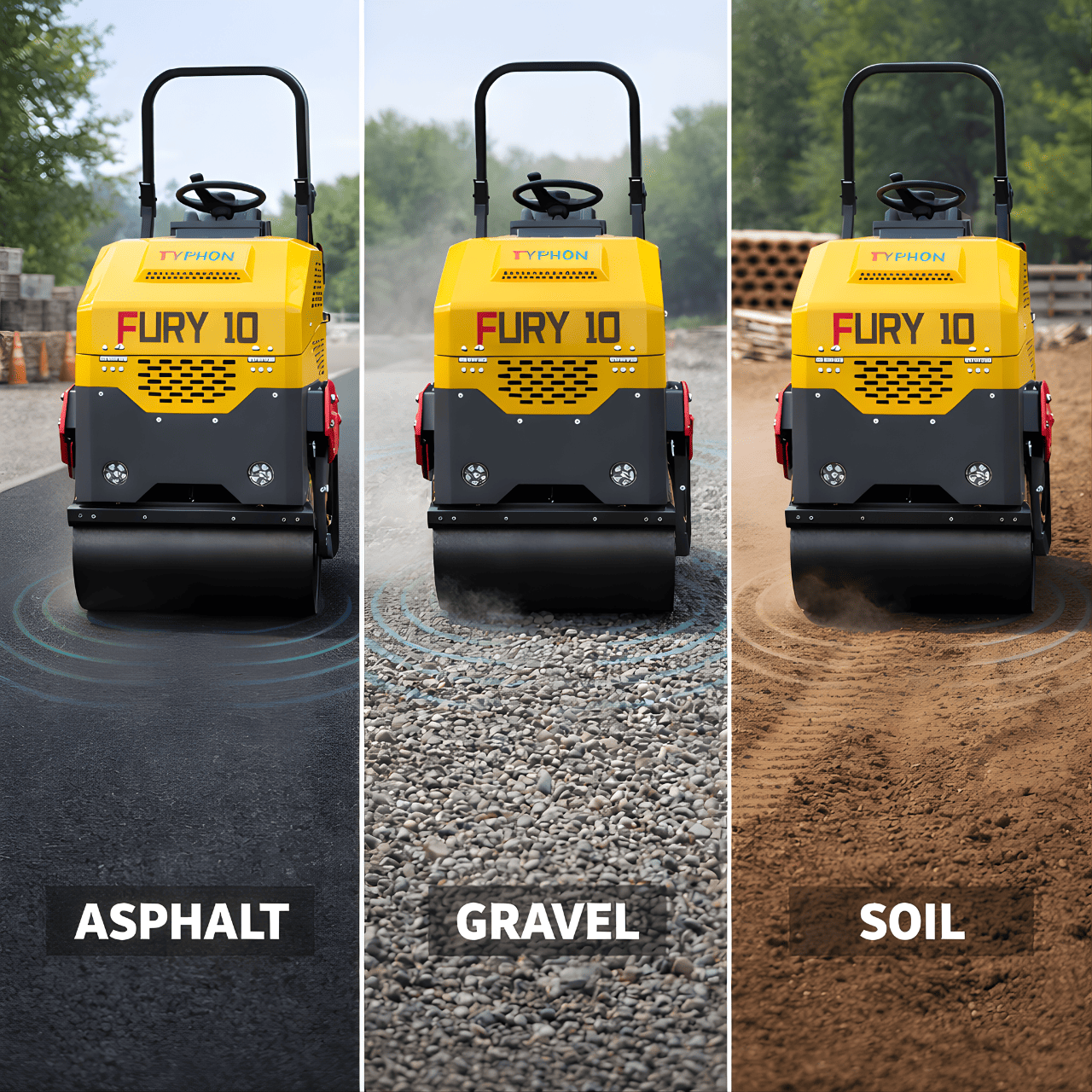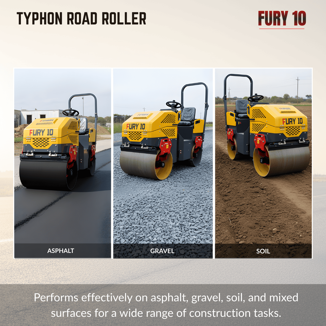 The TYPHON Fury 10 mini road roller delivers reliable and efficient compaction on asphalt, soil, and gravel. It features a 1-ton operating weight, providing the perfect balance of power and maneuverability for small-to-medium jobs, designed for road construction, paving, and landscaping, its compact footprint allows smooth operation in confined spaces while maintaining excellent stability.