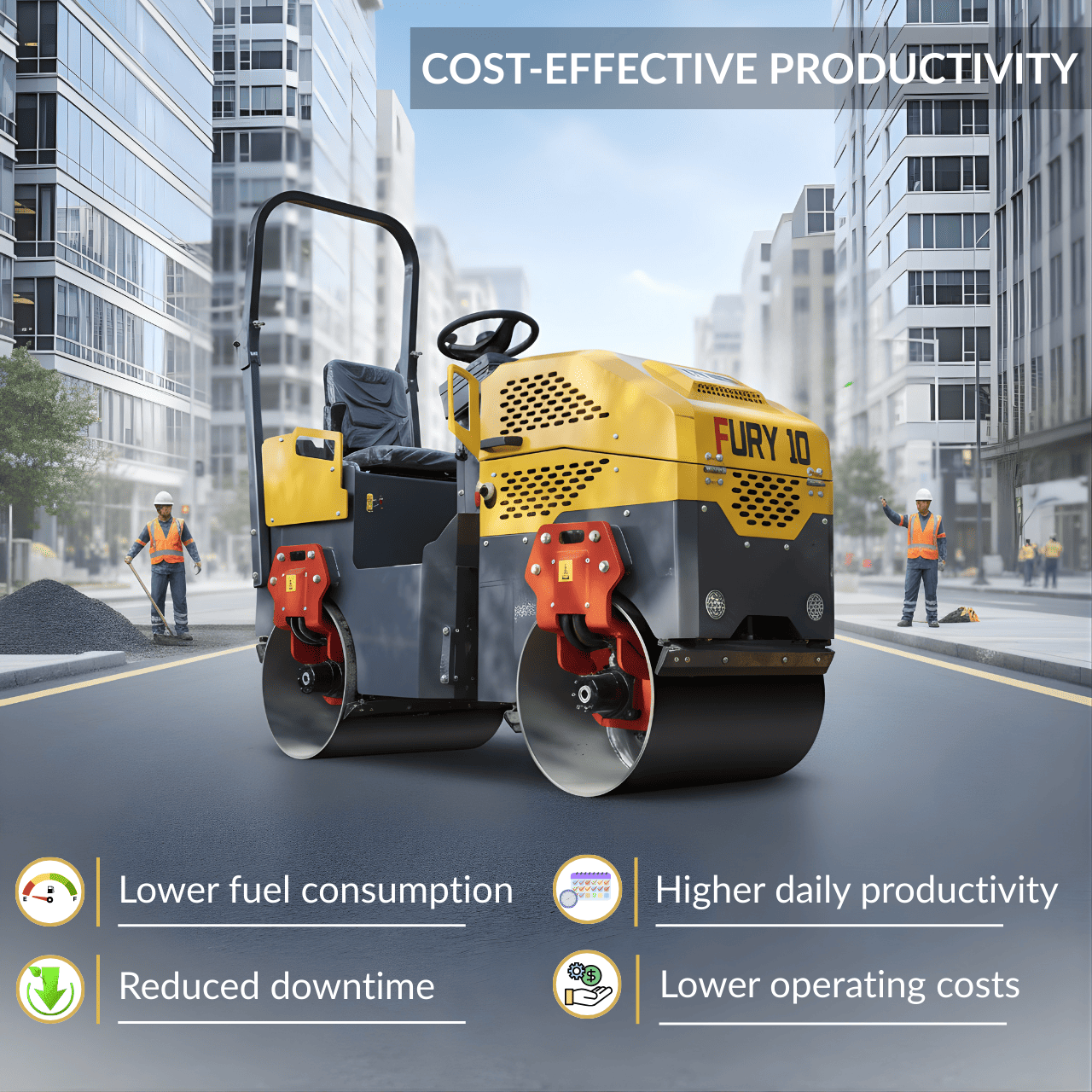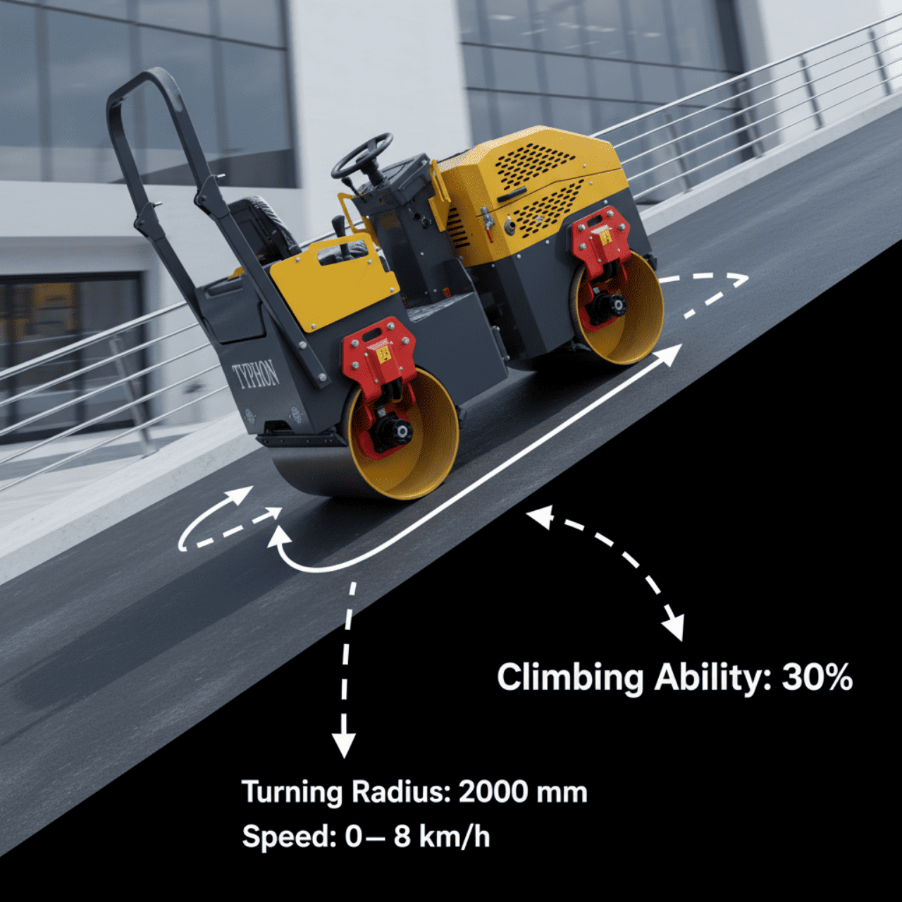 TYPHON Fury 10 mini road roller Featuring a 1-ton operating weight and powered by a Briggs & Stratton 13.5 HP gasoline engine, this air-cooled, four-stroke model delivers reliable performance with excellent fuel efficiency. It features an operating speed of 0–8 km/h for precise control and a tight 200 mm turning radius for smooth operation in confined spaces. Equipped with a 5.5 L fuel tank and a fuel consumption rate of 300 g/kW·h, it supports extended working hours with minimal downtime.